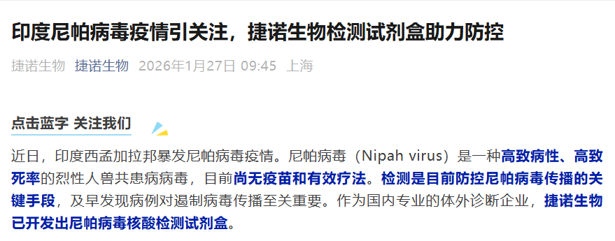 尼帕病毒(Nipah virus)是一种高致病性、高致死率的烈性人兽共患病病毒,目前尚无疫苗和有效疗法。检测是目前防控尼帕病毒传播的关键手段,及早发现病例对遏制病毒传播至关重要。作为国内专业的体外诊断企业,捷诺生物已开发出尼帕病毒核酸检测试剂盒。