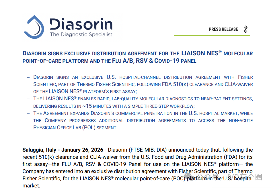纽约——Diasorin公司周一宣布已与赛默飞世尔科技旗下Fisher Scientific公司签订独家协议,将通过后者在美国医院渠道分销Diasorin的Liaison NES床旁快速分子诊断系统。这家意大利企业表示,全自动Liaison NES qPCR系统于去年12月获得美国食品药品监督管理局510(k)许可及CLIA豁免认证。该系统配备的检测试剂可在约15分钟内,通过三步简易流程完成甲型/乙型流感、SARS-CoV-2病毒及呼吸道合胞病毒检测。通过与赛默飞的合作,这家总部位于意大利萨卢贾的企业将加强其在美国医院市场的商业渗透。Diasorin表示正计划拓展其他分销渠道,以进入美国非急症诊疗的医师实验室细分市场。据该公司数据,美国分子呼吸道检测市场涵盖超7000家医院及13万个医师办公室实验室。Diasorin透露近期已扩充Liaison NES销售团队,与赛默飞世尔的合作将完善其现有美国商业体系。公司首席执行官卡罗·罗萨在声明中表示:"此项协议将加速我们进入医院细分市场,助力对接美国主要综合医疗网络。我们正积极推进与其他机构的合作,旨在实现非急症市场的全面覆盖,确保在所有关键客户类别中实施完备高效的市场进入战略。"当前在美国医院及医师实验室市场崭露头角的20分钟以内快速分子检测系统,还包括生物梅里埃的SpotFire系统以及Nuclein公司的Dash系统。LIAISON Nes是一款采用PCR技术的下一代即时检测平台,旨在无需专业实验室人员的情况下,为患者提供接近实验室质量的检测。该平台与一家美国"领先"连锁药房合作开发,采用三步操作流程,可在15分钟内获得检测结果。索灵诊断首席执行官卡洛·罗萨在声明中表示:"推出LIAISON Nes不仅是为我们的产品组合增添新一代分子检测平台,更标志着索灵正式进入分子即时检测市场,扩展了我们为患者提供快速、高质量诊断服务的能力。通过LIAISON Nes,我们正在重新定义分子诊断的可及性,这亦是索灵增长战略中的关键一步。"尽管Liaison Nes的首发panel聚焦于呼吸道感染,但Diasorin显然并不打算止步于此。据公司透露,其正在为Nes平台开发多个新的检测panel,包括针对A组链球菌(Group A Streptococcus)的检测,以及性传播疾病(STD)多重检测项目。