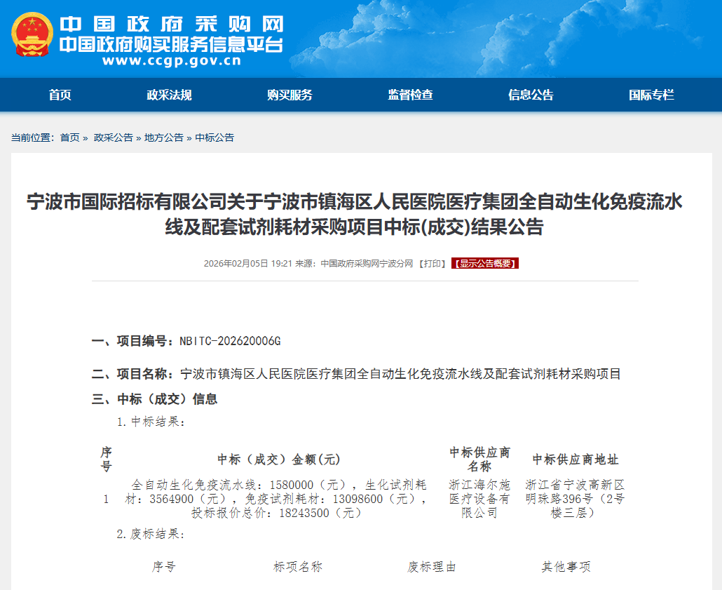 近日,宁波市镇海区人民医院医疗集团在医疗设备升级方面迈出重要一步。据中国政府采购网宁波分网于2026年2月5日发布的公告显示,该集团全自动生化免疫流水线及配套试剂耗材采购项目已完成招标工作,由浙江海尔施医疗设备有限公司中标,项目总金额达1824.35万元。