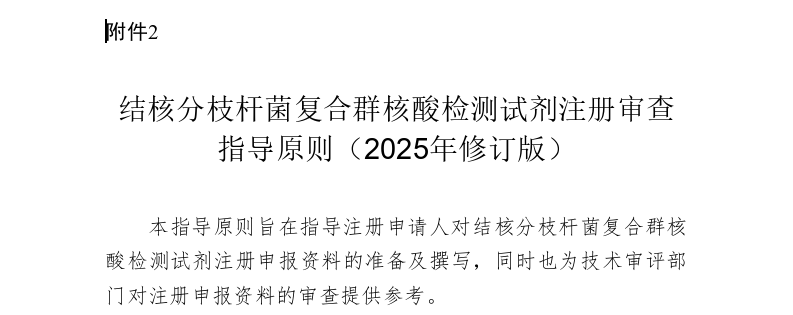 结核病仍是全球重大的公共卫生挑战。本次修订的《结核分枝杆菌复合群核酸检测试剂注册审查指导原则》旨在进一步提升结核病早期、快速分子诊断产品的质量。