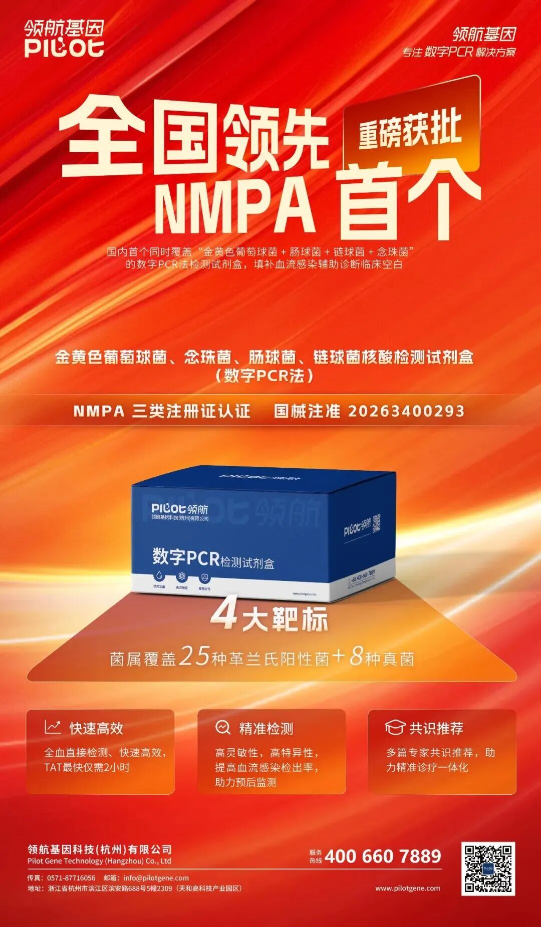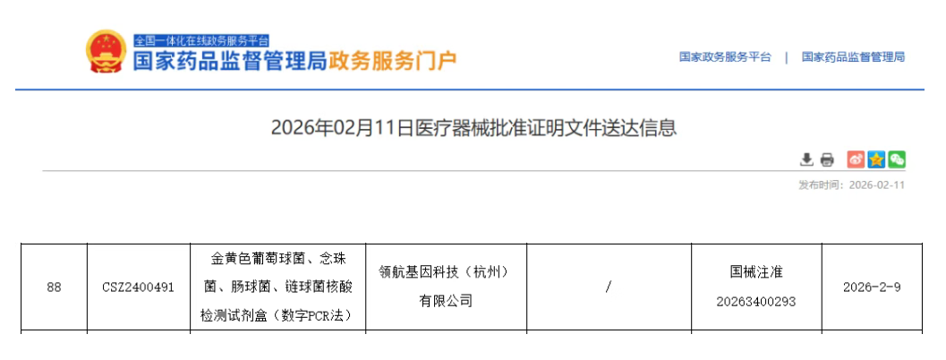 2月11日,国家药监局批准领航基因金黄色葡萄球菌、念珠菌、肠球菌、链球菌核酸检测试剂盒(数字PCR法),一次性能够鉴别四种常见的病原微生物,这是领航基因获批的第二款基于数字PCR技术的细菌联检产品,也是全行业第二款!