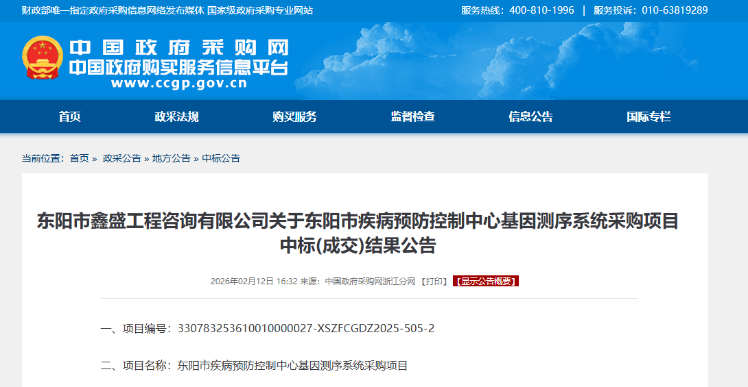 2月12日,东阳市疾病预防控制中心基因测序系统采购项目完成招标评审工作。根据浙江省政府采购网发布的中标公告,浙江某生物科技有限公司以
