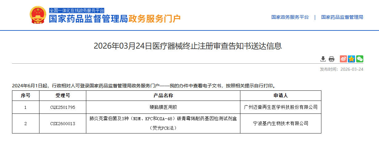 据国家药监局消息,3月24日,宁波基内的肺炎克雷伯菌及3种(NDM、KPC和OXA-48)碳青霉烯耐药基因检测试剂盒(荧光PCR法)终止注册。