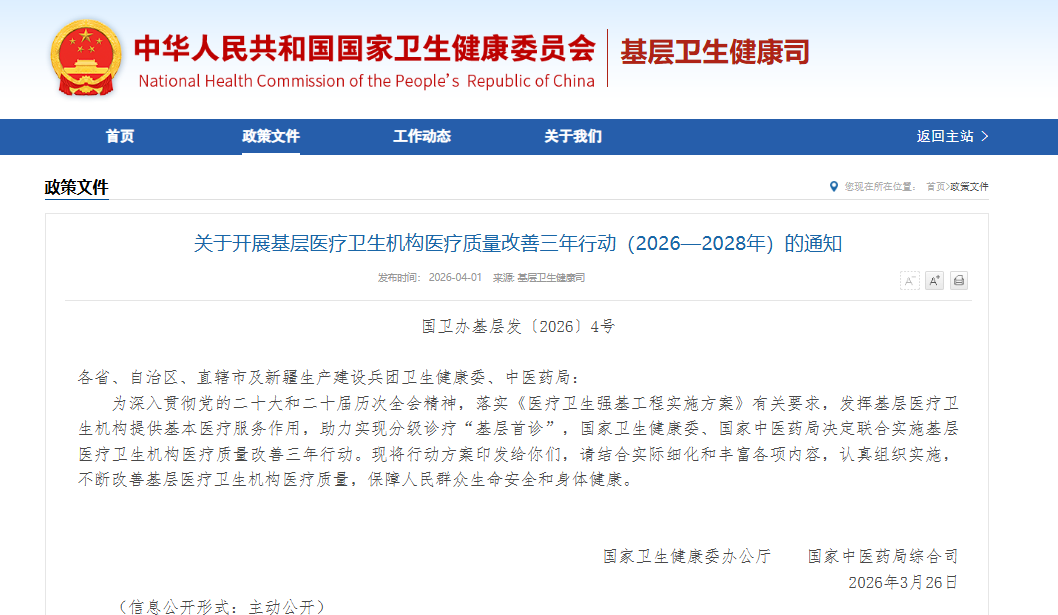 4月1日,卫健委发布《关于开展基层医疗卫生机构医疗质量改善三年行动(2026—2028年)的通知》,其中提到检验相关的内容: