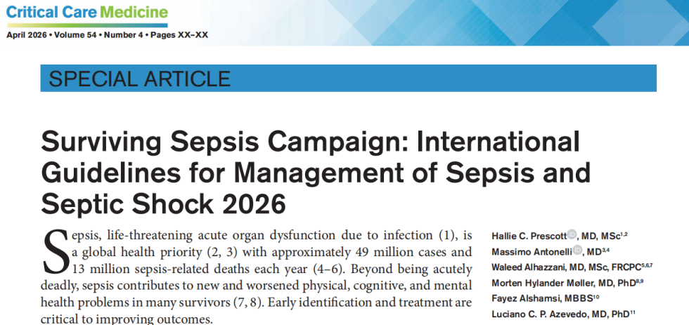 [1]Prescott HC, et al. Surviving Sepsis Campaign: International Guidelines for Management of Sepsis and Septic Shock 2026[J]. Critical Care Medicine, 2026, 54(4).