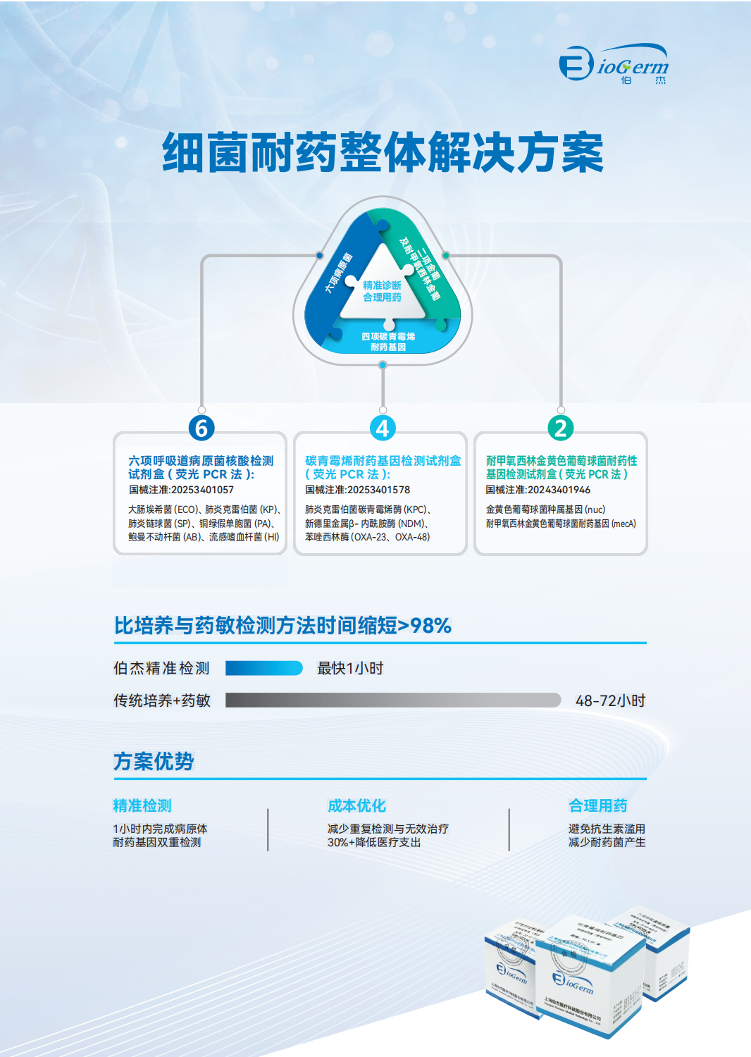 快速病原结果可缩短评估周期;病原快速诊断结果可为抗菌药物降阶梯决策提供关键参考依据;病原学结果是判断感染控制效果、安全终止用药的核心依据。上海伯杰医疗专注于重症感染领域体外诊断技术的研发与临床转化,自主研发的下呼吸道细菌六项核酸检测,可同步筛查大肠埃希菌、肺炎克雷伯菌、肺炎链球菌、铜绿假单胞菌、鲍曼不动杆菌、流感嗜血杆菌六个高发病原菌,快速明确下呼吸道感染溯源;碳青霉烯耐药核酸检测可明确KPC、NDM、OXA-23、OXA-48四大主流耐药基因型,均一小时内出具结果,可早期预警碳青霉烯耐药风险,助力临床落实抗菌药物精细化管控与耐药防控要求,全面契合SSC 2026指南核心导向,为脓毒症规范化救治提供全流程实验室技术支撑。