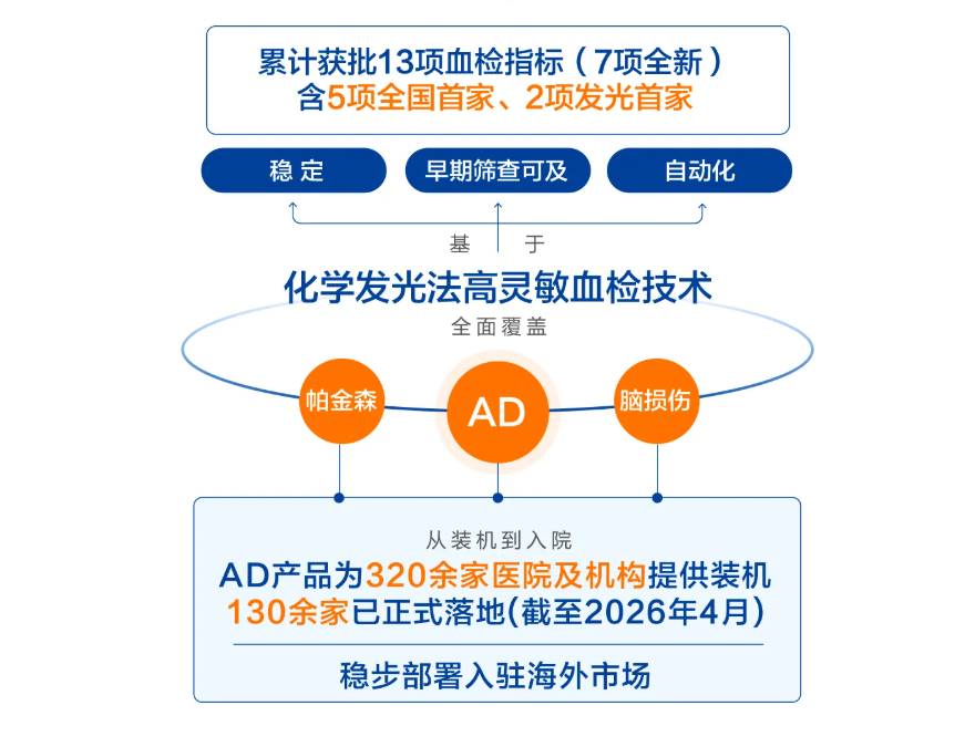 贝克曼库尔特走“血检+影像+药物”三角联动路线。其Access p-Tau217/Aβ1-42血浆比值检测获FDA突破性设备认定;2026年4月与GE医疗战略合作,构建“血液筛查→影像精准诊断”一体化路径。