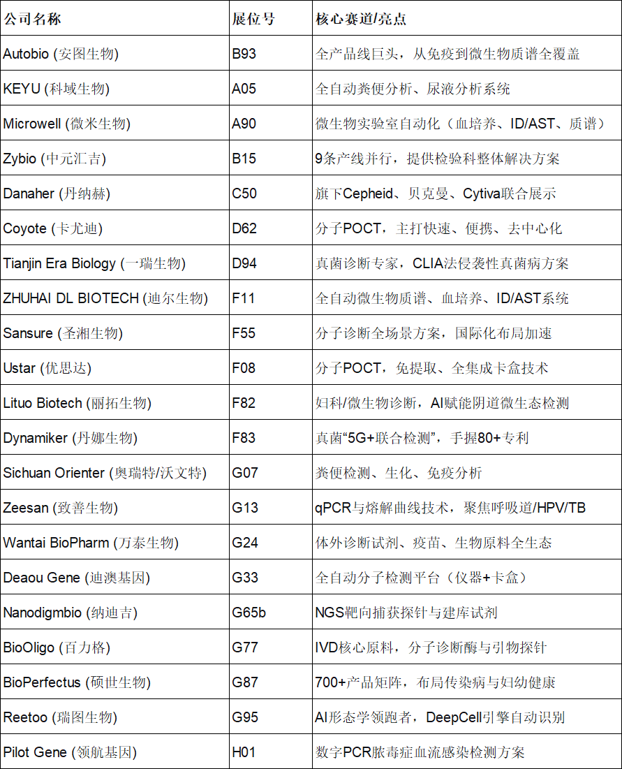 梳理本届大会近30家中国IVD及相关企业(含诊断、原料、耗材),我发现中国企业参展已从过去的“散兵游勇”进化为“集团军作战”。展位具体分布如下(按展位号排序):