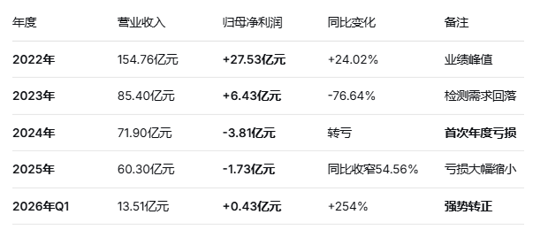 国内第三方医学检验龙头金域医学(603882.SH)4月24日晚间披露了2025年年报及2026年一季报。财报显示,在行业需求承压、检验价格下调等挑战下,公司2025年归母净利润为-1.73亿元,较2024年首次年度亏损的-3.81亿元大幅收窄54.56%。2026年第一季度,公司实现净利润同比暴增254%的强势转正,经营拐点已基本确认。