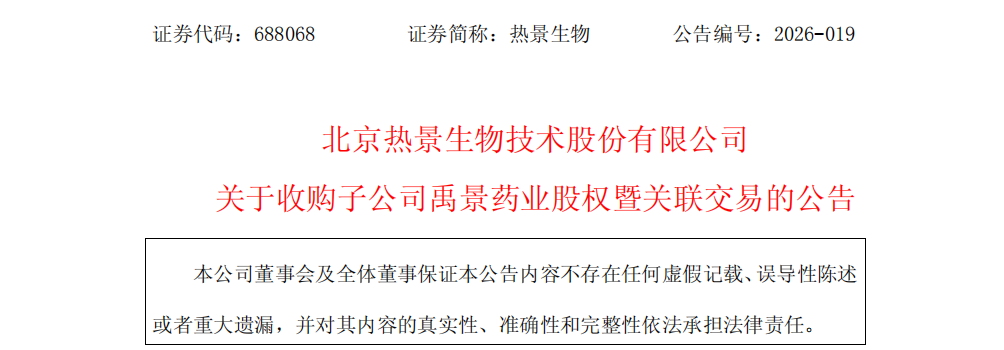 4月25日,北京热景生物技术股份有限公司(以下简称“热景生物”)发布公告称,公司拟以405万元收购子公司北京禹景药业有限公司(以下简称“禹景药业”)剩余42%的股权。本次收购完成后,热景生物将持有禹景药业100%股权,后者成为上市公司全资子公司。
