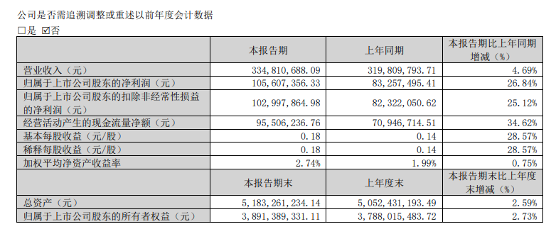 报告期内公司实现营业收入3.35亿元,同比增长4.69%;归属于上市公司股东的净利润达1.056亿元,同比大幅增长26.84%;