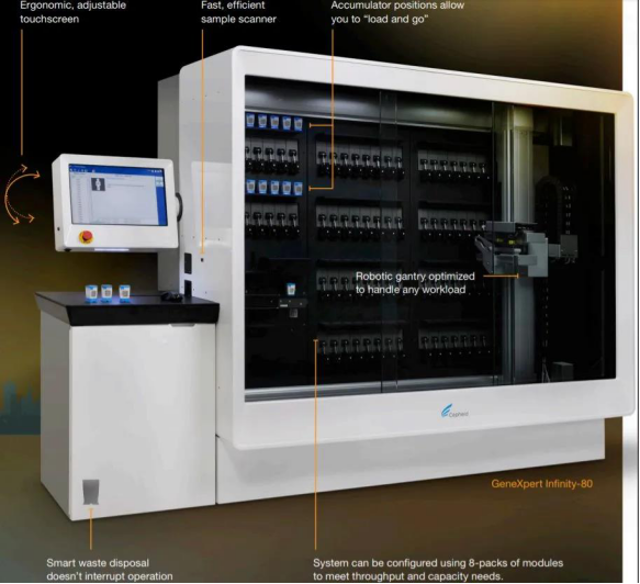 赛沛的分子流水线比较有特色,是集成了很多单检的模块在一起,有48和80两种型号,通过标准化的模块进行叠加形成一个超大通量的自动化平台,既能满足高通量,也保持了单模块检测的优势,可实现多项目运行。赛沛在国内主要以结核、院感等细菌检测产品为主,因此该款仪器也主要用于结核等项目的检测。与传统的分子诊断市场打了个差异化,主要定位在结核病定点医院,当然随着目前赛沛产品菜单的丰富,这款产品也正在逐渐走向综合医院。