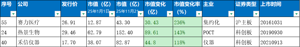 热景生物、禾信仪器等企业在市值增长榜中位居前列,反映出IVD+创新药的跨界想象力和高端仪器等细分赛道的高成长性。