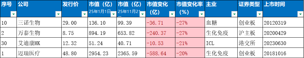 2025年以来,中国IVD行业经历了政策调整、技术迭代与市场竞争的多重考验。从2025年1月1日至11月21日,部分企业市值出现剧烈波动,反映出其在产品管线、市场拓展、资本认可度等方面的分化。塞力医疗,热景生物,禾信仪器成为今年市值增长最快的IVD相关企业,其中塞力医疗涨幅高达236%,面上消息看,和其参股创新药企业华纪元生物有关,赶上政策风口;而热景生物则是因为其重要参股公司舜景医药、尧景基因、禹景药业、智源生物等创新药企,在抗体药物与核酸药物领域的布局有关。而禾信仪器则是因并购量羲技术进入量子计算赛道而带来市值大幅增加!与市值增长不同的是,三诺生物、万泰生物、艾迪康、迈瑞医疗成为今年以来市值跌幅最大的企业,均超过了20%,其中三诺和万泰跌幅达到了-27%,跌去近三分之一的市值。作为行业龙头,迈瑞医疗市值虽仍居首位,但出现较大回落,面上消息,受行业集采、竞争加剧及市场预期调整影响较大。万泰生物在HPV疫苗与检测领域曾表现突出,但2025年市值显著回调,与产品周期、市场竞争及利润压力相关。三诺生物专注血糖监测,市值下降反映出血糖仪市场竞争激烈、价格承压及增长乏力。趋势解读与启示