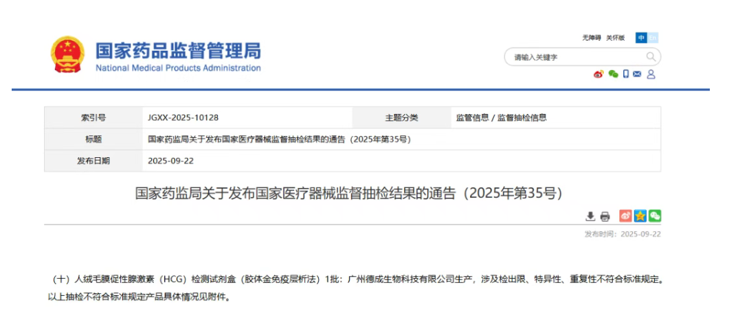 9月22日,国家药监局发布关于发布国家医疗器械监督抽检结果的通告(2025年第35号),其中广州德成生物科技有限公司生产的1批人绒毛膜促性腺激素(HCG)检测试剂盒(胶体金免疫层析法),涉及检出限、特异性、重复性不符合标准规定。