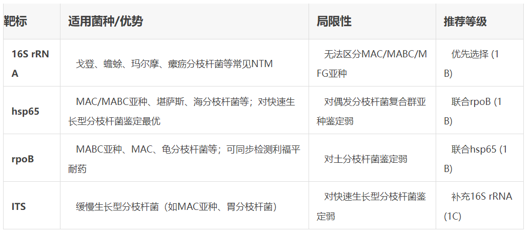 推荐1-2: 临床需根据目标菌种选择靶标组合(如MAC/MABC需联合hsp65/rpoB/ITS)。