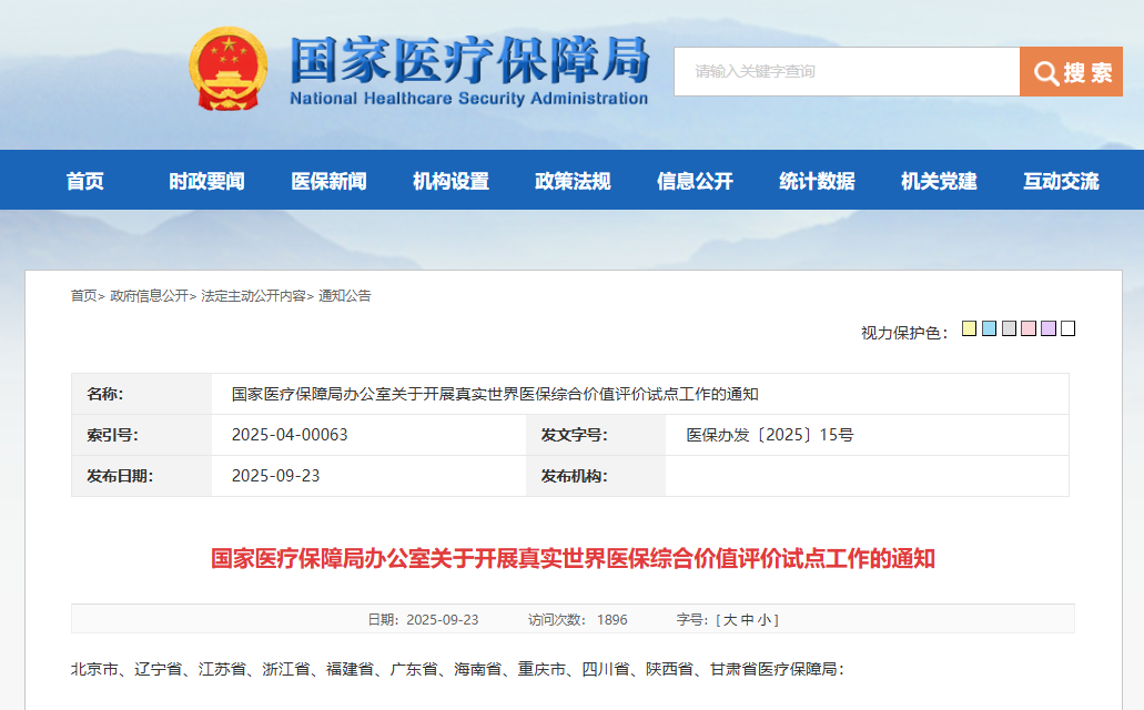 国家医疗保障局办公室于9月23日发布《关于开展真实世界医保综合价值评价试点工作的通知》,决定在北京市、广东省、海南省等11个省份的先行地区开展试点工作,计划到2027年底形成一套基于真实世界研究的医保综合价值评价体系。