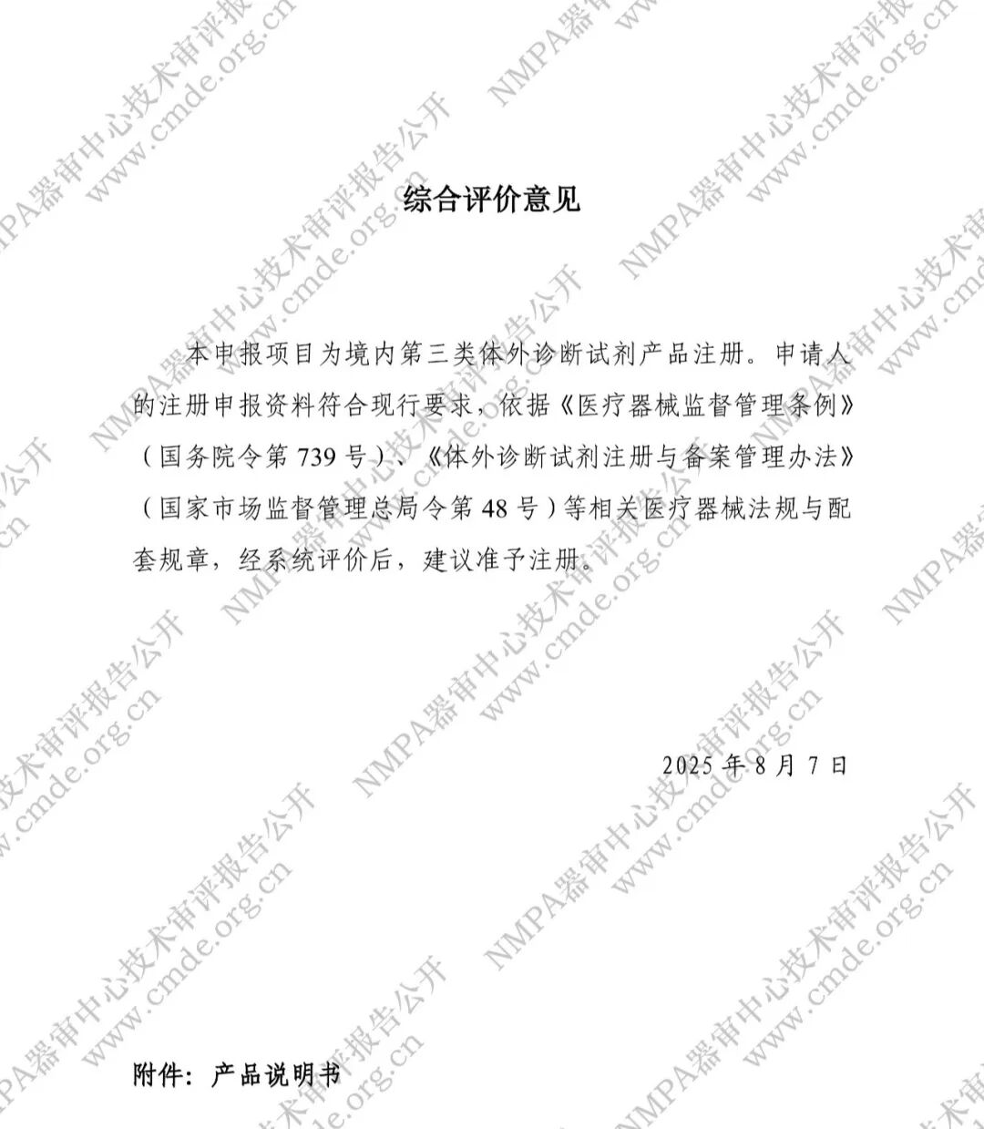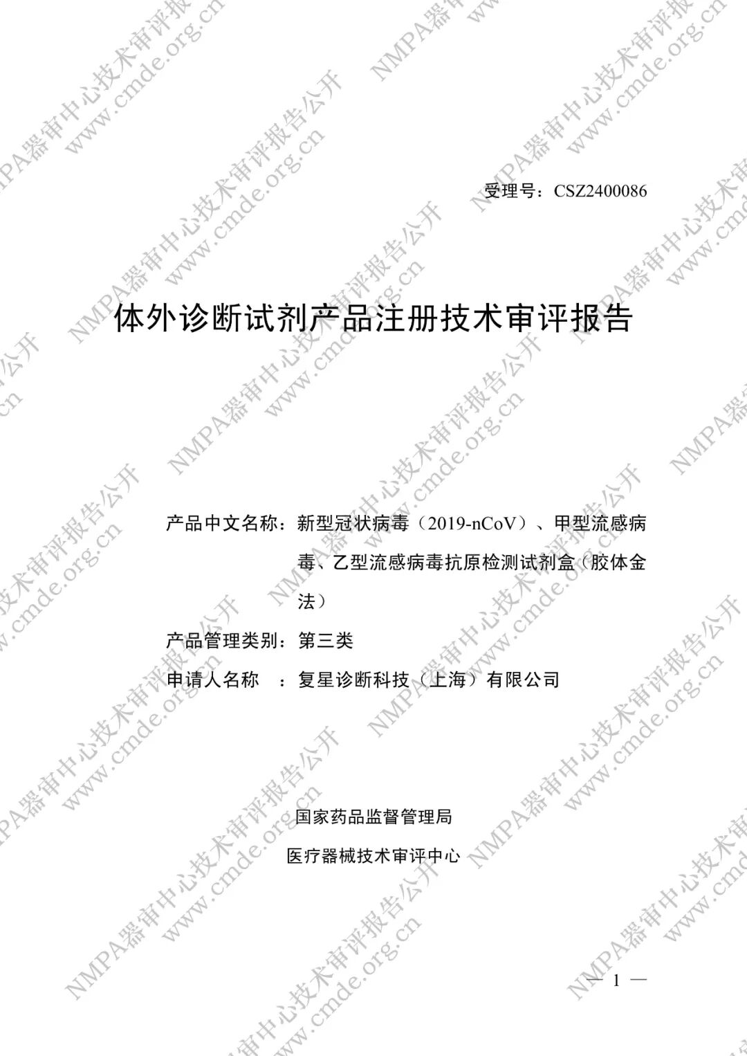 产品注册技术审评报告。申请人: