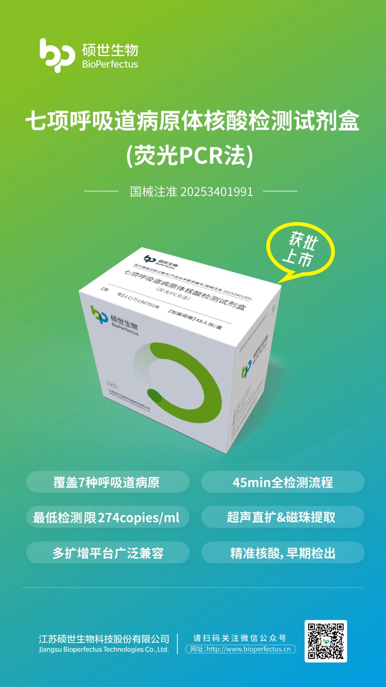近日,硕世生物自主研发的七项呼吸道病原体核酸检测试剂盒(荧光 PCR 法)正式获批(注册证号:国械注准20253401991)。该产品用于体外定性检测人咽拭子样本中甲型流感病毒、乙型流感病毒、呼吸道合胞病毒、呼吸道腺病毒、副流感病毒、鼻病毒和肺炎支原体。覆盖主流病原,最少够用组合,多场景适配方案助力呼吸道病原防控检测需求。
