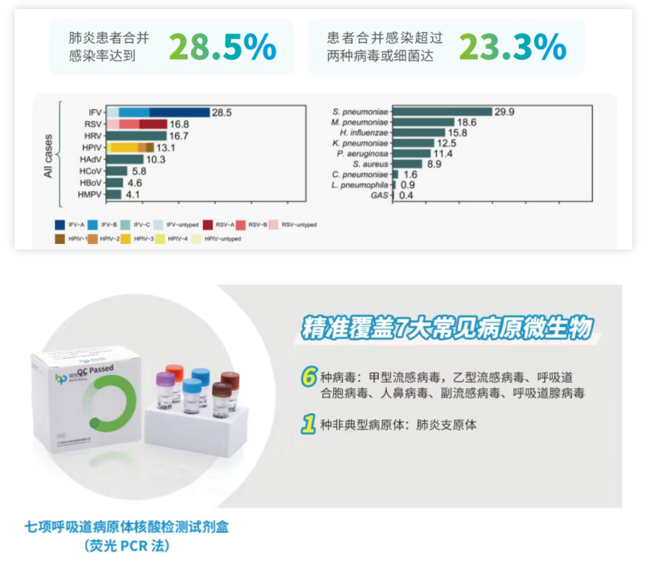 中国疾病预防控制中心(CDC)曾发表在《Nature communications》一项历时11年的急性呼吸道感染(Acute Respiratory Infections,ARIs)监测数据研究显示,我国最常见的病原体是流感病毒(IFV(28.5%),肺炎支原体(18.6%)、呼吸道合胞病毒(RSV)(16.8%)、人鼻病毒(HRV)(16.7%)、人副流感病毒(HPIV)(13.1%)、人腺病毒(HAdV)(10.3%)等,同时肺炎患者合并感染率达28.5%,患者合并感染超过两种病毒或细菌达23.3%,一次7项联合检测主流病原,更快区分临床流感样患者病原类型,实现精准用药、合理诊疗,有效避免抗生素滥用。