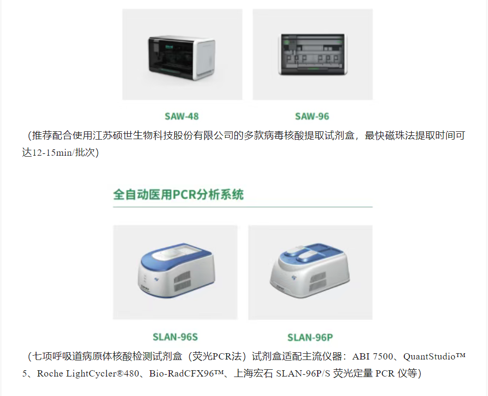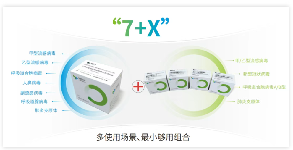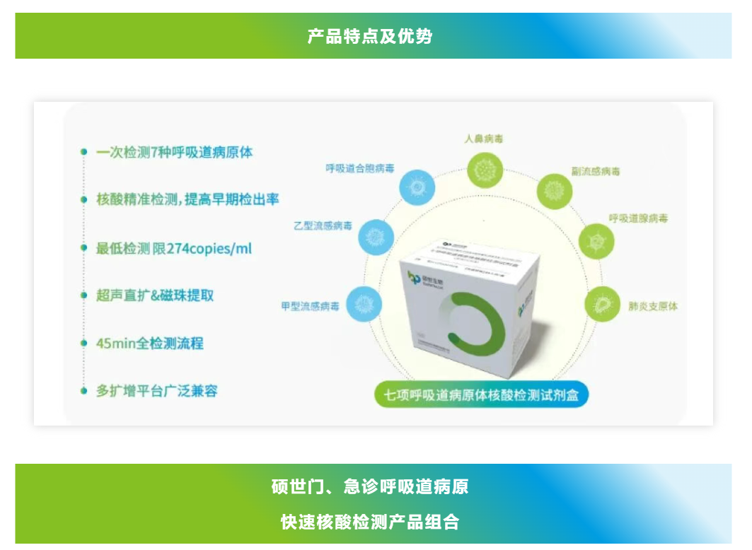 硕世门、急诊呼吸道病原快速核酸检测产品组合,包含一款呼吸道七项呼吸道病原体核酸检测试剂盒(荧光PCR法)国械注准20253401991及四款单/双检试剂盒,分别是甲型/乙型流感病毒核酸检测试剂盒(荧光PCR法)国械注准20163401432、新型冠状病毒2019-nCoV核酸检测试剂盒(荧光PCR法)国械注准20203400384、呼吸道合胞病毒A型和B型核酸检测试剂盒(荧光PCR法)国械注准20163400799、肺炎支原体核酸检测试剂盒(荧光PCR法)国械注准20253401261,适用于不同临床使用场景,以最小够用组合进行分组适配检测,极大提高病原识别效率及诊疗效率。