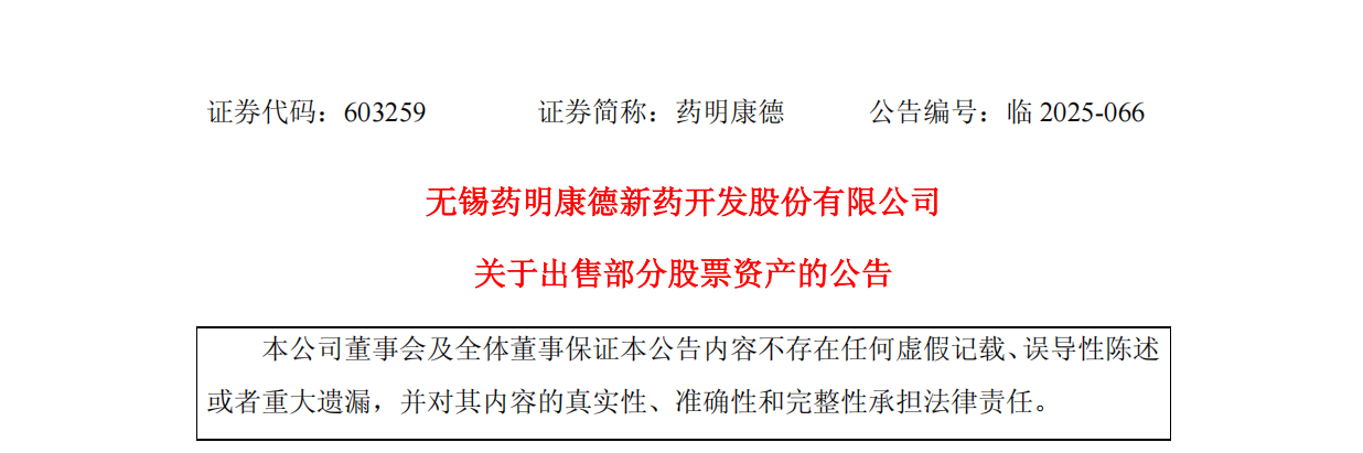 2025年10月10日,无锡药明康德新药开发股份有限公司(603259.SH)发布公告称,公司已于10月8日通过大宗交易方式出售其持有的药明合联(2268.HK)3030万股股份,约占药明合联总股本的2.47%,成交金额约23.46亿港元。根据公告,此次交易是药明康德在2025年第二次临时股东大会授权范围内进行的资产处置。公司表示,出售所得资金将用于加速全球产能及能力建设、吸引和保留优秀人才,持续强化公司一体化CRDMO(合同研究、开发与生产)业务模式。财务数据显示,本次交易对公司业绩带来积极影响。经初步核算,此次出售药明合联股票预计将为公司2025年度税后净利润贡献约16.79亿元人民币,占公司2024年度经审计归属母公司股东净利润的比例超过10%。值得注意的是,这已是药明康德今年第三次披露减持药明合联股份。截至本次交易后,2025年度累计出售药明合联股票的投资净收益对公司税后净利润的影响已达约43.51亿元。药明康德在公告中强调,通过出售股票资产获得的现金收益将用于推进全球产能建设。这一举措表明,在面对全球医药研发市场竞争加剧的背景下,公司正进一步聚焦核心主业,强化其在CRDMO领域的全球布局。市场分析人士指出,药明康德此次减持是其资产结构优化和资金战略调配的重要一步。在医药外包行业竞争日趋激烈的环境下,公司将资源集中投向核心业务领域,有助于巩固其全球行业领先地位。药明合联是药明康德体系内专注于抗体偶联药物(ADC)等生物偶联药物领域的子公司,于2023年在香港联交所主板上市。此次交易完成后,药明康德仍持有药明合联相当比例的股份。公司提示,上述投资收益数据为初步核算结果,具体影响金额将以注册会计师年度审计确认后的结果为准。声明:本微信注明来源的稿件均为转载,仅用于分享,不代表平台立场,如涉及版权等问题,请尽快联系我们,我们第一时间更正。
