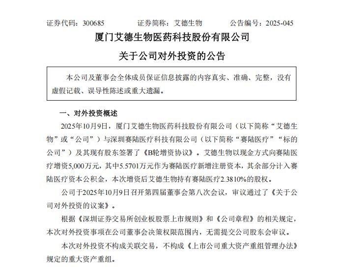 10月9日,厦门艾德生物医药科技股份有限公司(股票代码:300685,以下简称“艾德生物”)正式宣布,与深圳赛陆医疗科技有限公司(以下简称“赛陆医疗”)及其现有股东签署《B轮增资协议》。根据协议,艾德生物将以现金人民币5,000万元对赛陆医疗进行增资,其中5.5701万元计入注册资本,其余部分计入资本公积金。本次增资完成后,艾德生物将持有赛陆医疗2.3810%的股权。