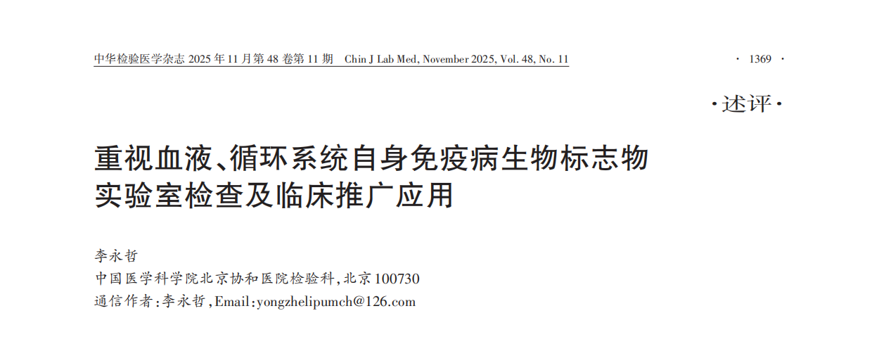 近日,北京协和医院检验科李永哲教授在《中华检验医学杂志》2025年第11期发表述评,系统总结了血液与循环系统自身免疫病相关生物标志物的研究进展与临床应用现状。文章指出,自身免疫性疾病可导致贫血、紫癜、心肌炎、心律失常等严重症状,而实验室检查在早期诊断、分型及预后评估中具有关键作用。
