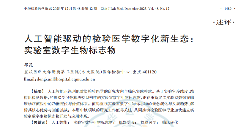 近日,一篇发表于《中华检验医学杂志》2025年第12期的述评文章《人工智能驱动的检验医学数字化新生态:实验室数字生物标志物》,系统阐释了人工智能(AI)如何深度重塑检验医学的科研与临床实践。文章指出,基于机器学习等AI技术构建的“实验室数字生物标志物”,正推动检验医学从“测量疾病”向“理解疾病”的模式跃迁,标志着该领域迈入智能化发展的新阶段。文章作者、重庆医科大学附属第三医院医学检验中心的邓昆教授在文中强调,随着检验医学进入多组学、高通量检测时代,数据维度激增但价值并未同步提升,存在“数据冗余”与“价值稀释”的矛盾。人工智能的崛起为破解这一困境提供了关键技术路径。从“单一指标”到“智能算法”:疾病风险评估的范式转变文章回顾了肾脏疾病标志物的演进历程,清晰展现了这一转变:从早期依赖血肌酐、尿素氮等单一指标,到使用eGFR等复合公式,再发展到如今融合实验室数据、蛋白组学与电子病历信息的AI模型(如KidneyIntelX),实现了从“公式模型”到“智能算法模型”的跨越。这种由AI驱动的“实验室数字生物标志物”,其核心在于利用算法挖掘海量、多维度实验室结构化数据中隐含的复杂关联与动态模式,从而实现对疾病更早期、更精准的风险预测、个体化分层和疗效评估。值得关注的是,LDB已不再停留于学术概念,正加速走向临床落地。文中列举了多个获得国际监管机构批准的典型案例:败血症风险评估:Prenosis公司开发的Sepsis ImmunoScore?于2024年4月获美国FDA批准,成为首个用于败血症风险评估的LDB,通过22项实验室与临床变量生成风险评分,辅助临床早期识别。糖尿病肾病进展预测:Renalytix AI开发的KidneyIntelX.dkd?于2023年获FDA批准,用于预测糖尿病肾病进展风险。2025年9月,基于AI的Kidney Klimisk Algorithm也获得了欧洲CE认证。肿瘤早期筛查:如肝癌早期检测模型GALAD等,能在常规肿瘤标志物未显著异常时,通过识别多维模式的细微变化实现早期预警,性能(AUC值)显著优于传统单指标方法。同期《中华检验医学杂志》也刊发了多项国内研究成果,例如基于机器学习构建的肺癌预测模型、老年噬血细胞综合征死亡风险预测模型等,展示了我国在该领域的积极探索。文章同时指出,LDB的发展仍面临技术与监管的双重挑战。数据标准化与互操作性是跨机构推广的瓶颈;AI模型的“黑箱”特性影响临床信任,提升可解释性至关重要;在性能评价上,需超越仅看AUC值的局限,引入校准度、临床决策曲线分析等更贴近临床实际价值的指标。此外,必须建立符合医疗器械监管要求(如中国NMPA、美国FDA、ISO标准)的完整研发与审批体系,确保其安全性、有效性与可追溯性。展望未来,LDB的发展将走向体系化建设。文章提出,需深度融合实验室信息系统(LIS)、医院信息系统(HIS)与AI引擎,打造具备自主学习与决策支持能力的“实验室智能中枢”。同时,推动多模态数据融合(整合检验、病历、影像等信息),建立标准化的模型评估框架,并通过产、学、研、医深度协同,加速创新成果向可落地、可监管的临床产品转化,最终构建具有自主创新能力的中国检验医学AI诊断技术体系。人工智能正催生检验医学的新生态,使实验室从数据生产者转变为临床智能决策的关键支持者。尽管前路仍有挑战,但抓住AI赋能的历史机遇,聚焦标准化、可解释性与临床转化,必将推动检验医学在数字健康与精准医疗时代实现全面跃升。引用本文:邓昆. 人工智能驱动的检验医学数字化新生态:实验室数字生物标志物[J]. 中华检验医学杂志,2025, 48(12): 1489-1493. DOI: 10.3760/cma.j.cn114452-20251027-00604.声明:本微信注明来源的稿件均为转载,仅用于分享,不代表平台立场,如涉及版权等问题,请尽快联系我们,我们第一时间更正,谢谢!