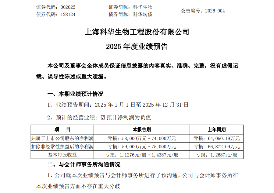 近日,国内体外诊断(IVD)行业知名企业——上海科华生物工程股份有限公司(证券代码:002022,证券简称:科华生物)发布了2025年度业绩预告。预告显示,公司预计2025年度净利润将继续为负,亏损范围在5.8亿元至7.4亿元之间。而上年同期(2024年度)公司已亏损约6.41亿元。这意味着,