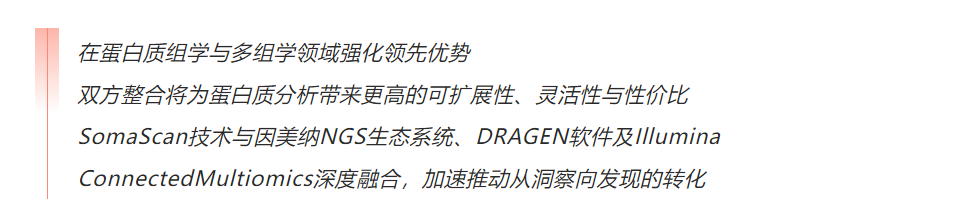 SomaLogic的技术能够深入解析蛋白质的功能、相互作用及修饰机制,助力加速对复杂生物学和人类健康的理解。客户将得益于SomaScan、Illumina Protein Prep、SomaSignal检测、DRAGEN软件及Illumina Connected Multiomics的整合能力,大规模生成丰富的多组学数据集,并可灵活选择最适合自身需求的工具与工作流程。