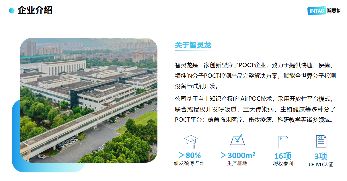 在快速发展的体外诊断(IVD)领域,分子POCT正以其即时、精准的检测优势,逐渐成为医疗健康产业的重要发展方向。智灵龙(InTag Biosciences)作为一家致力于“让诊断如刷牙般便捷”的高科技创新企业,正以其领先的技术平台与开放的合作生态,推动分子检测走向家庭、基层与多元场景。智灵龙成立于2023年3月,是一家以分子POCT为核心,融合人工智能、半导体与生物技术的平台型科技企业。公司总部位于杭州,已在上海、硅谷、波士顿等地设立研发与合作网络,并已完成Pre-A轮融资,获多家知名投资机构与产业资本支持。公司由三位在半导体、生物技术与人工智能领域具有全球影响力的科学家联合创立,并拥有涵盖院士、MIT Media Lab创始人、国际药企高管等在内的顶尖顾问团队,具备深厚的技术底蕴与产业化能力。智灵龙自主研发的 AirPOC 技术平台,实现了分子检测的“极致小型化、低成本与易用性”,具备以下突出优势:- 自研高效酶体系:灵敏度达单分子级别,支持多重检测与复杂样本;