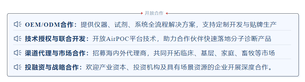 该平台已成功应用于呼吸道传染病、畜牧疫病、生殖健康、海关检疫、科研教学等多个领域,并逐步推进CE、NMPA等国际认证。AirPOC-1:掌上型四通道荧光PCR仪,适用于移动检测与现场快速筛查;AirPOC-4:四模块独立系统,支持随到随检,适用于中通量场景;配套试剂盒:涵盖流感、新冠、非洲猪瘟、生殖健康等多个方向,具备高灵敏度与操作便捷性。公司采取“平台赋能 + 自产商业化”双轨模式,既支持合作伙伴共同开发,也在动保、科研及部分IVD领域开展自主布局。智灵龙现面向全球,诚挚邀请以下类型的合作伙伴,共同拓展分子POCT的无限可能:智灵龙以“让分子检测走进每一个家庭”为长期愿景,致力于构建以AI为驱动的智能健康生态系统。我们相信,通过开放、协同、共赢的合作模式,能够加速技术落地,实现精准医疗的普惠化与可持续发展。如您对以上合作机会感兴趣,或希望了解更多关于智灵龙技术与产品的信息,欢迎通过IVD从业者网与我们取得联系。任先生:guodong.ren@intag.bio