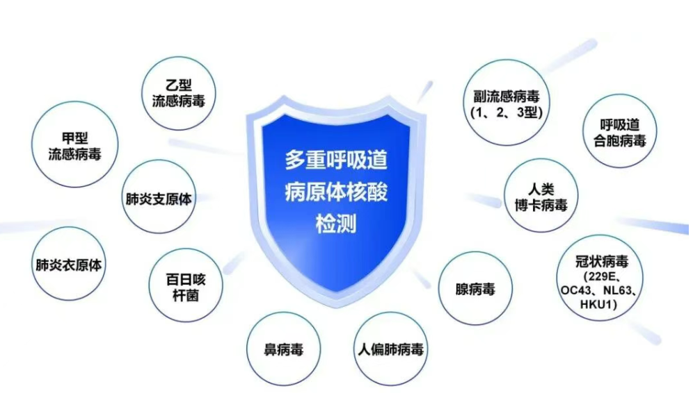 检测范围全面覆盖:该产品可精准定性检测人咽拭子中12种呼吸道病原体共17个核酸靶标,具体检测病原体包括甲型流感病毒、乙型流感病毒、副流感病毒(1、2、3型)、呼吸道合胞病毒、鼻病毒、人偏肺病毒、冠状病毒(229E、OC43、NL63、HKU1)、腺病毒、人类博卡病毒、百日咳杆菌、肺炎衣原体、肺炎支原体,其中副流感病毒、冠状病毒检测结果不分型。