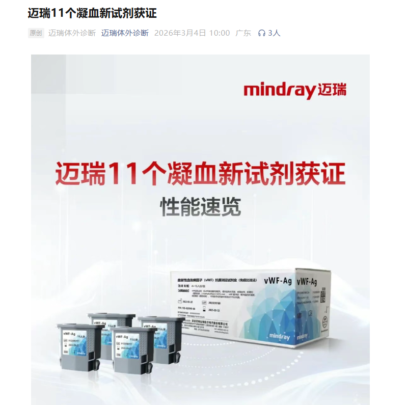 2026年开年,国内体外诊断领域迎来一则重磅消息。迈瑞医疗在3月4日一天之内,宣布了11个凝血试剂新产品获批拿证。这不仅是一次产品线的简单扩容,更像是迈瑞在凝血赛道的一次“总攻”信号——从基础凝血到血栓与止血的全貌,正在被快速补齐。