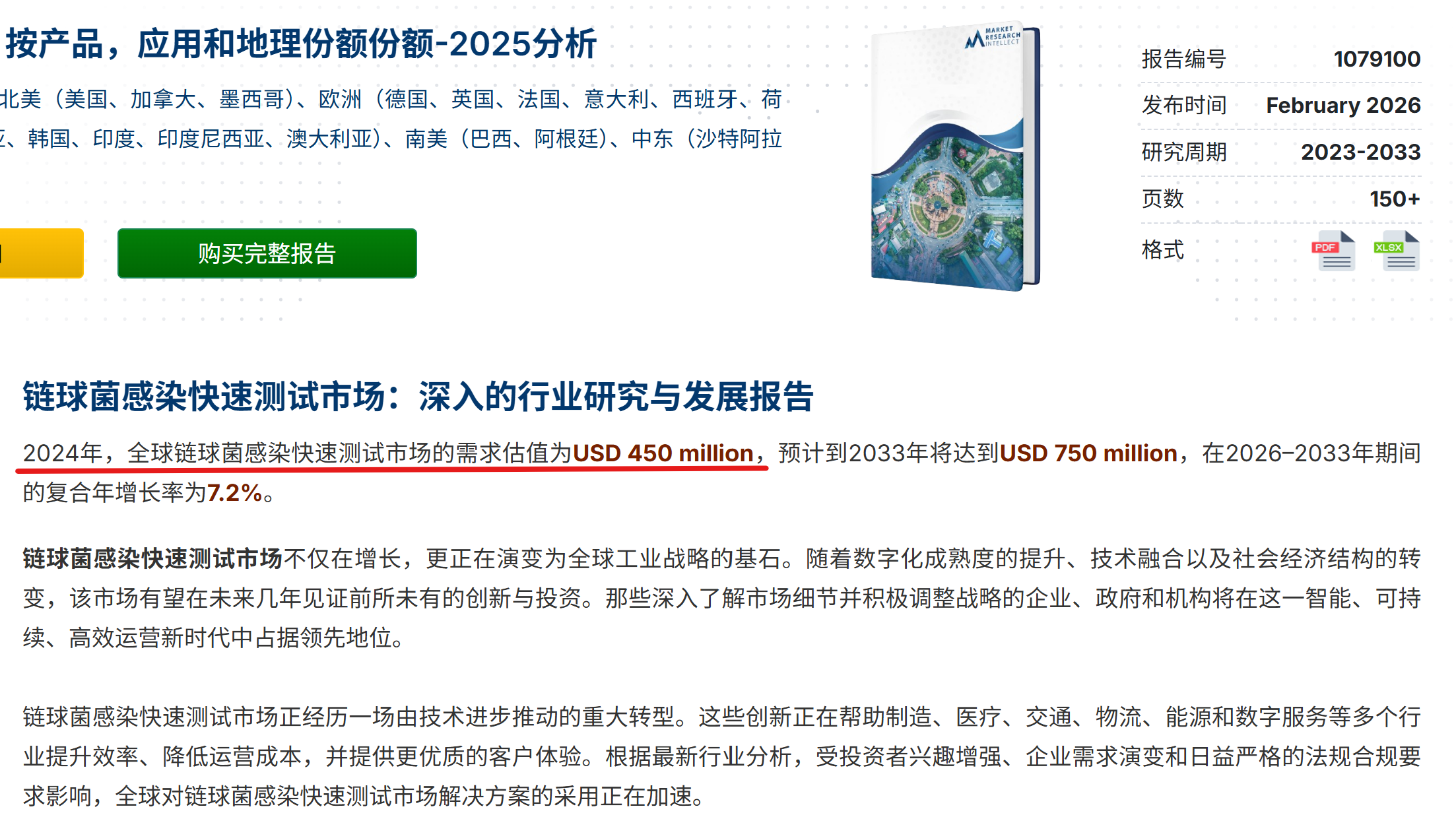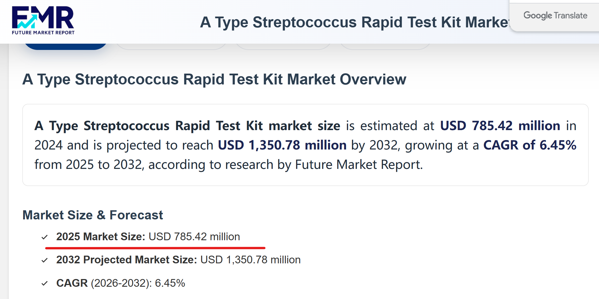 1. 全球市场规模:基于Grand View Research报告的POCT呼吸道检测市场总额,按Strep A检测在呼吸道 POCT 中的产品线和营收占比(约 10%)推算