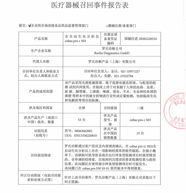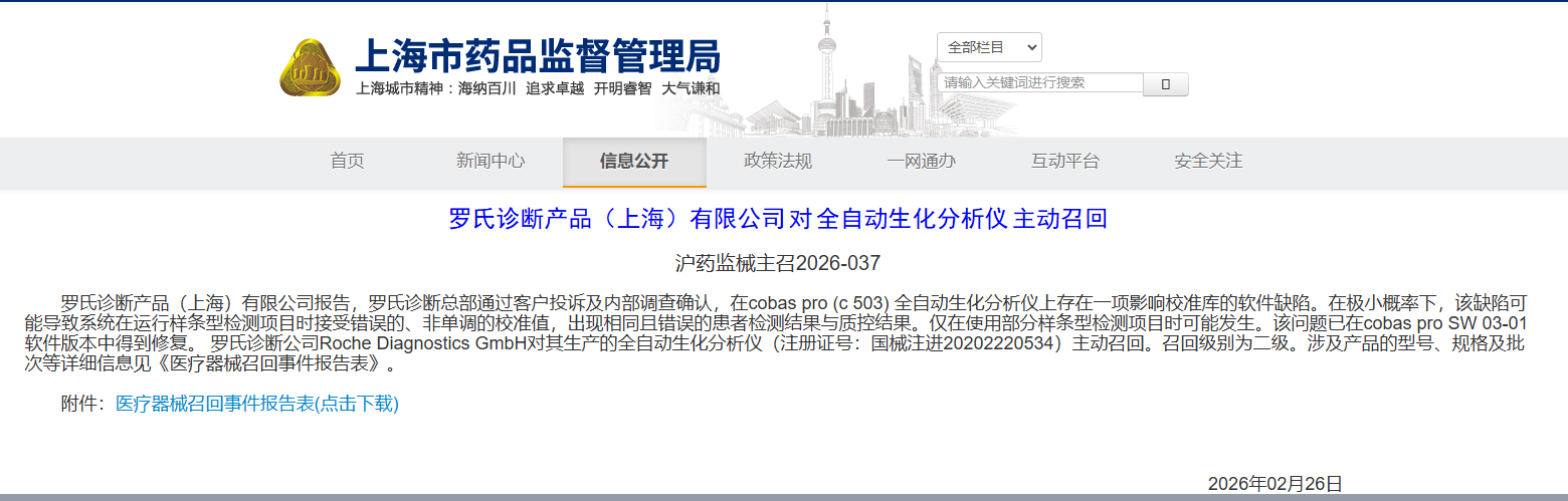 近日,根据上海市药品监督管理局发布的官方通告(沪药监械主召2026-037),罗氏诊断产品(上海)有限公司对其代理的全自动生化分析仪(cobas pro c 503)发起主动召回。此次召回源于罗氏总部通过客户投诉及内部调查发现的一项软件缺陷,召回级别定为二级。