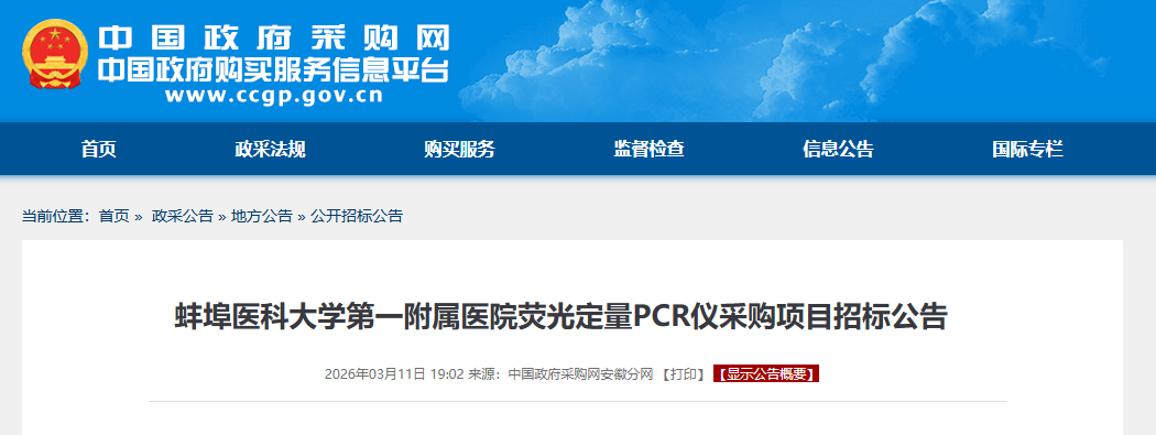 近日,蚌埠医科大学第一附属医院发布荧光定量PCR仪采购项目招标公告,拟投入预算资金120万元,采购4台荧光定量PCR仪,以进一步提升医院医疗检测能力和科研水平。