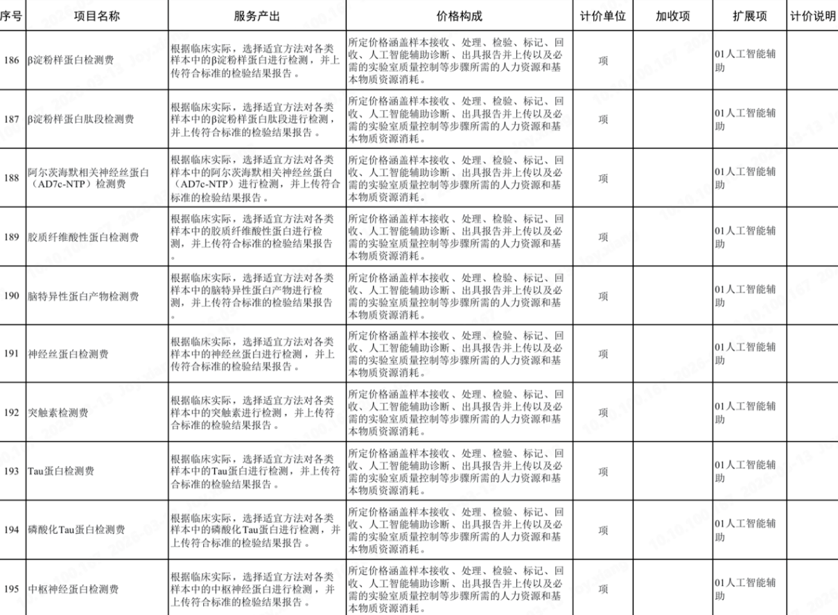 指南明确,医疗服务价格项目的核心对象不再是某一种具体检测技术,而是 “检测指标本身” 。在这一框架下,β淀粉样蛋白、Tau蛋白、GFAP、NFL等10项AD核心标志物被系统纳入国家价格项目体系(第186–195项)。