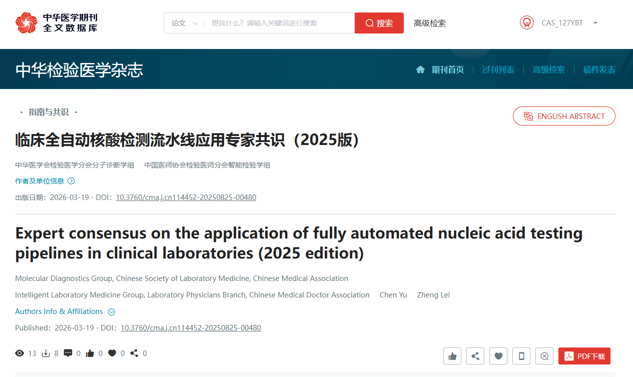 《临床全自动核酸检测流水线应用专家共识(2025版)》(以下简称《共识》)。