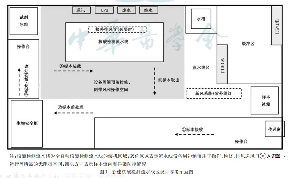 共识1:核酸检测流水线宜放置于具有通风条件的独立区域或基因扩增实验室的标本制备区,并确保空间足够,方便工作。在通过生物安全风险和核酸污染风险评估后也可以放置在其他非独立的场所。