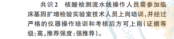 共识2:核酸检测流水线操作人员需参加临床基因扩增检验实验室技术人员上岗培训,并经过严格的仪器操作培训和考核后方可上岗。